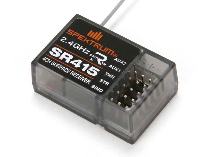 Obsahem balení je čtyřkanálový přijímač Spektrum SR415. Přijímač je voděodolný a kompatibilní s vysílači s modulací DSMR nebo DSM2. Rozměry 35.8x23.6x14.3mm, hmotnost 9g. Napájení 3.5–9.6V, anténa koaxiální 210mm.